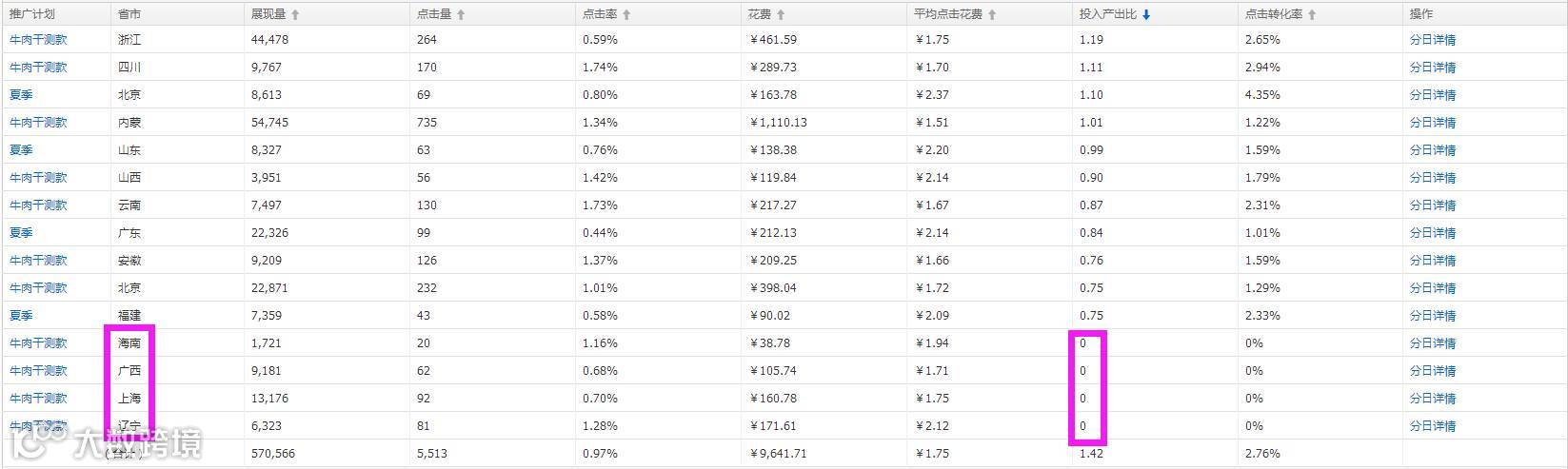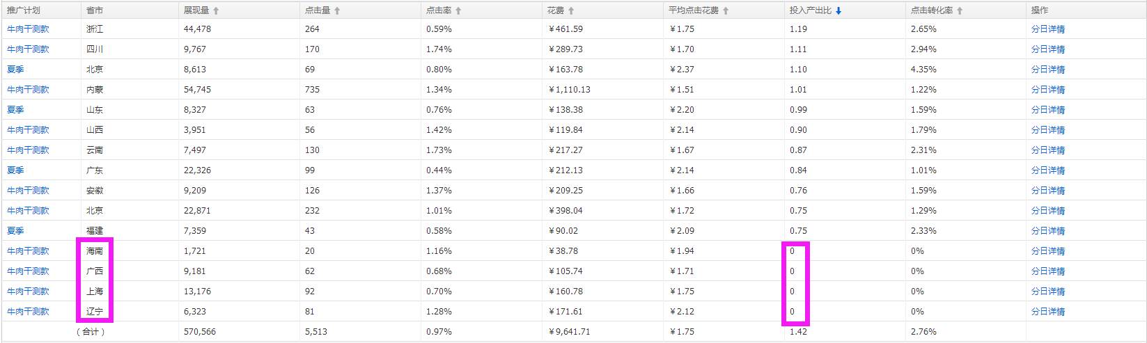 结合地域数据和直通车地域投放报表,广西/上海没有转化,可以去掉投放,节省无效费用。