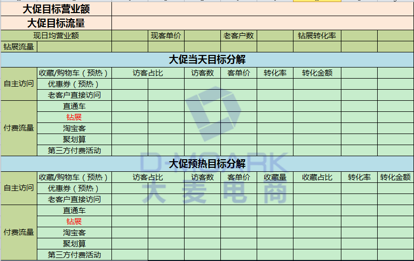 比如:年中大促目标营业额是*****,根据销售额=访客数*转化率*客单价来倒推,年中大促的目标流量是****。然后根据目标流量再拆分【钻石展位】在年中大促时段所承担的访客数占比,预估访客数,转化率等等,具体操作如下EXCEL表格做流量的拆分所示。