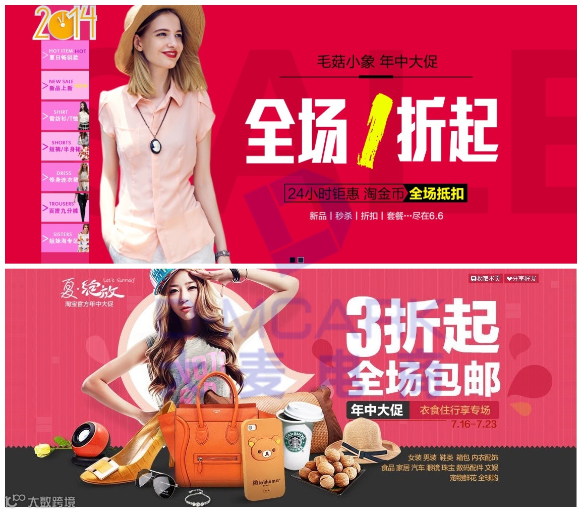 而2014年度年中大促刚好和世界杯时间重合,则钻石展位图除了配合大促之外,并添加了世界杯元素,从文案中,场景背景图中都突出“激情”元素。