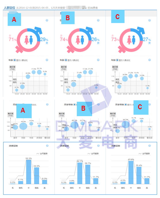 接着,根据所找出来的店铺再【淘宝指数】中进行对比,并找出最接近的竞争对手。如下图所示,从人群定位,消费层次和买家等级进行对比。