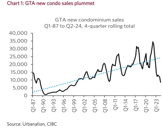 报告称:“因此,加拿大最大市场新住宅建设的主要驱动力--新公寓销售已经跌至20世纪90年代末以来的最低水平。”