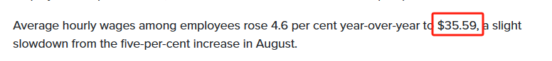 另外,加拿大人的平均时薪同比上涨4.6%,达到35.59加元,增幅低于8月份的5%。