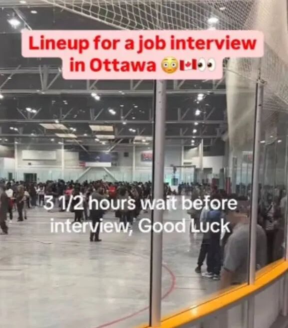 这是一个在渥太华举办的招聘会,可以看见,举办场所的冰场被前来求助的人群几乎站满,大家都在排队递交简历。