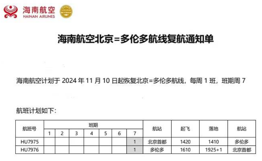除此之外,海南航空也宣布—11月10日起,多伦多直飞北京的航线也正式恢复,每周1班!