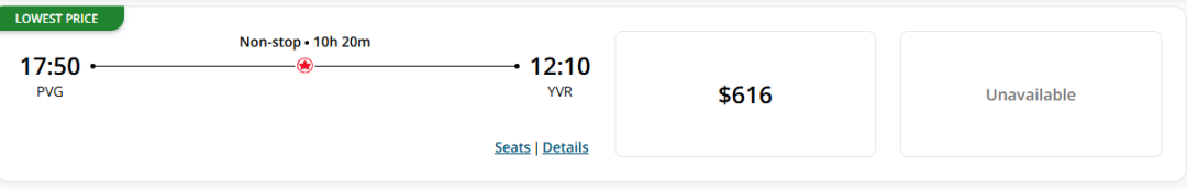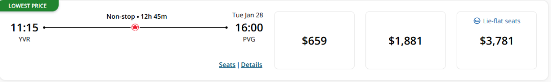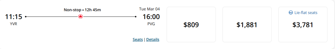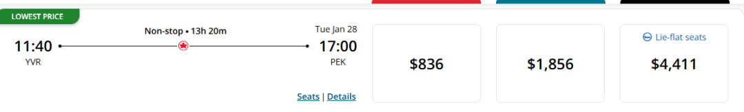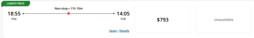 同一个时间段,1月29日至2月6日,温哥华直飞上海,去程836刀,回程793刀;