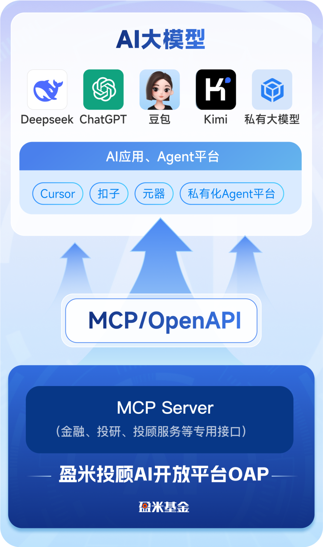 基于此,盈米基金开创性地推出投顾AI开放平台(简称:OAP)。该平台通过统一网关,整合了MCP和OpenAPI等协议,实现与Cursor、Dify等主流平台的无缝对接。使AI大模型具备了专业的财经资讯获取、投研分析能力、投顾服务能力和组合策略构建能力。通过盈米OAP上的MCP Server,能让大模型与AI应用、Agent高效协同,为客户提供更专业、更个性化的投资咨询服务。