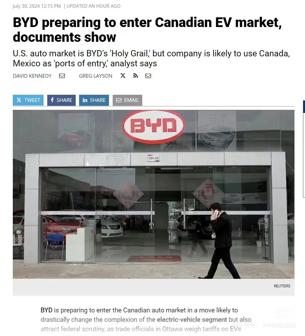 虽然该文件没有具体说明比亚迪计划的时间表,但确实讨论了对电动汽车征收关税的可能性,以及这家总部位于深圳的公司开始在加拿大销售乘用电动汽车的计划。