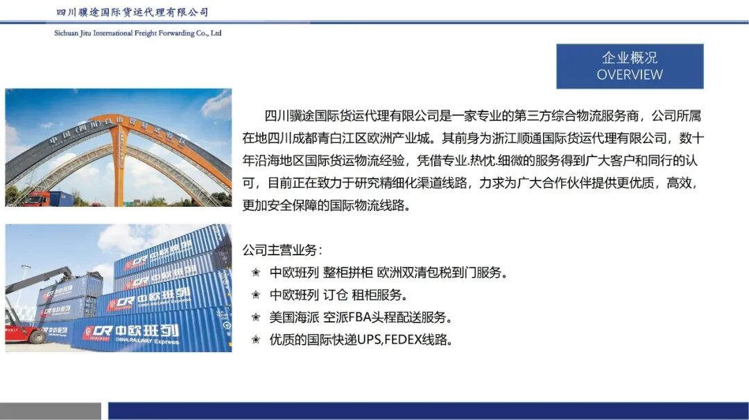 四川骥途国际货运代理有限公司是一家专业的第三方综合物流服务商,公司所属在地四川成都青白江区欧洲产业城。凭借十几年沿海地区国际货运物流经验,凭借专业.热忱.细微的服务得到广大客户和同行的认可,目前正在致力于研究精细化渠道线路,力求为广大合作伙伴提供更优质,高效,更加安全保障的国际物流线路。目前主要致力于欧洲铁路,依托成都,重庆,西安三地的地理优势,主要从事欧洲铁路双清包税,欧洲铁路去程,回程订舱,欧洲铁路租箱等业务。