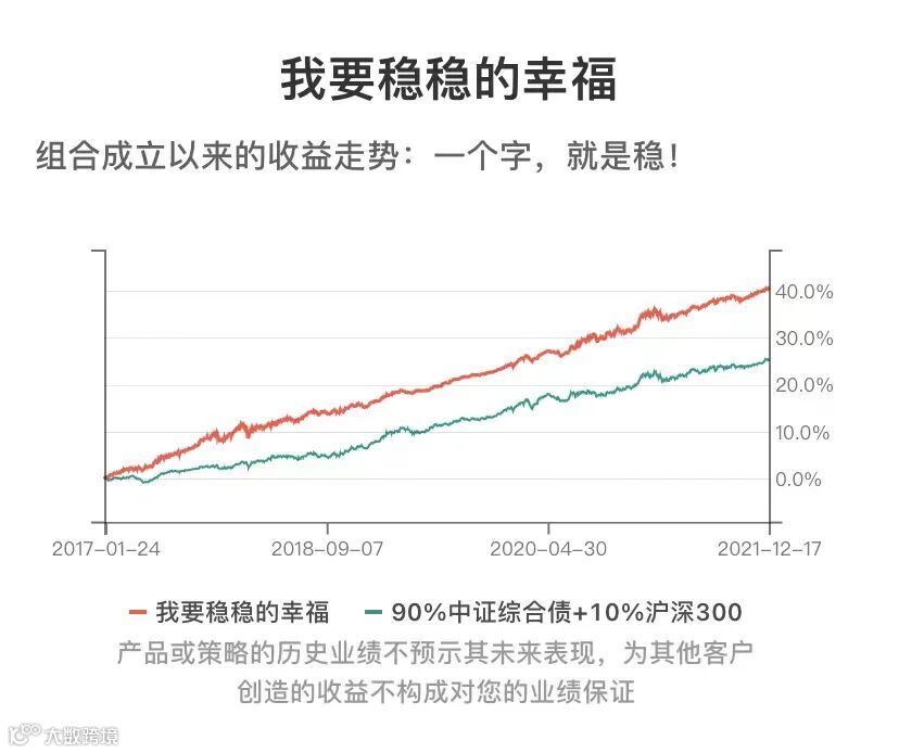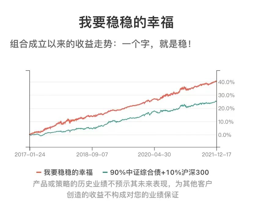 盈米且慢平台在2017年初上线了一个“固收+”组合,也就是被广大的投资者所喜爱和熟悉的「稳稳的幸福」。从这个组合的数据来看,2017年1月上线到现在,近5年的时间里,组合的滚动中365天持有的正收益概率是100%,而年化收益达到7.13%。可以说,“固收+”策略是一个比较适合稳健理财客户的高性价比策略。