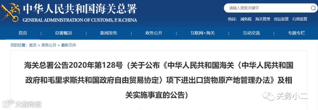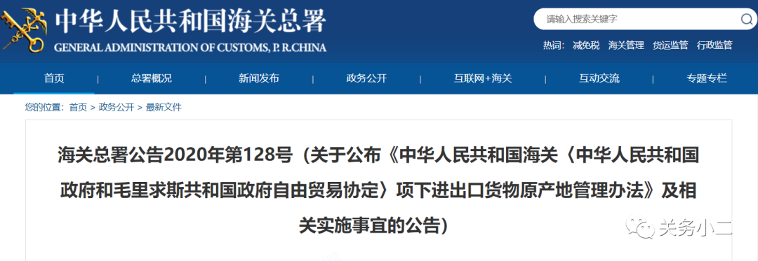 《中国-毛里求斯自贸协定原产地证书将于2021年1月1日生效》,12月18日,海关总署发布2020年第128号公告,公布中国和毛里求斯自由贸易协定项下进出口货物原产地管理办法,并于2021年1月1日起正式实施。