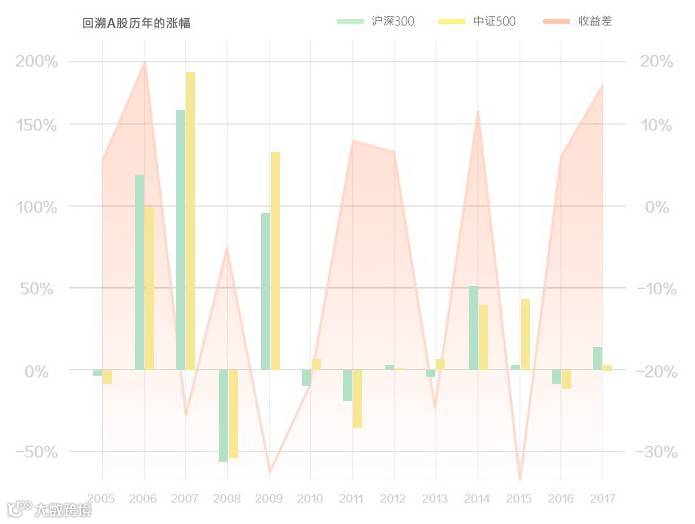 A股市场历年大、小盘的收益率差异较大的,差异最大一年是2015年,差了大约37%,也就是大小盘轮动风格比较显著。因此,理论上基于A股市场的二八轮动策略应该是相对有效的。