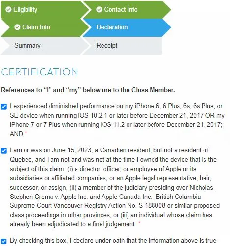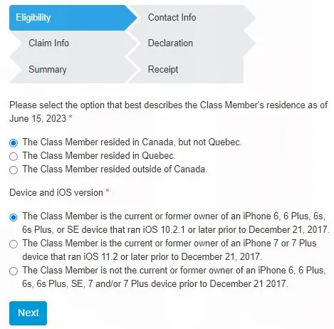 根据该项集体诉讼网站,符合资格索偿的用户包括:在2017年12月21日之前拥有过iOS 10.2.1或更高版本的手机用户,这适用于iPhone 6、6 Plus、6s、6s Plus或SE,又或使拥用过iOS 11.2或更高版本的手机用户,这适用于iPhone 7或7 Plus的加拿大智能手机用户。