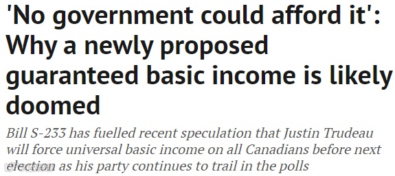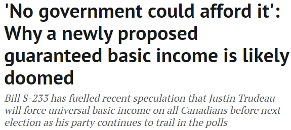 “所以我认为在加拿大广泛实施全民基本收入的可能性非常接近于零,而不是作为小规模试点。”