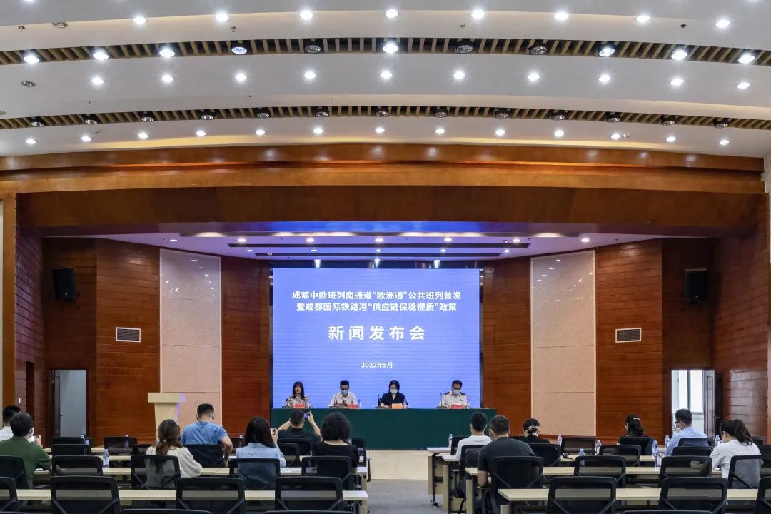 5月31日,成都中欧班列南通道“欧洲通”公共班列首发暨成都国际铁路港“供应链保稳提质”政策新闻发布会在成都国际铁路港召开。