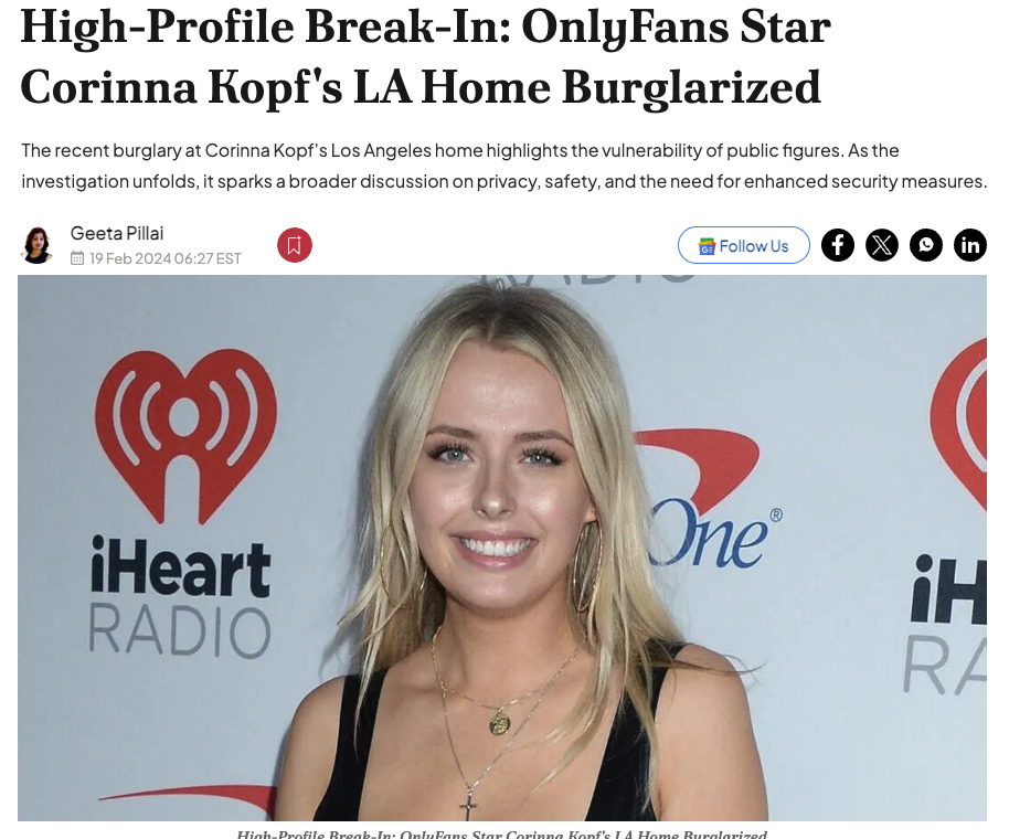 明星们的行程几乎都会在社交媒体上被披露,罪犯可以轻易掌握它们的行踪,入室抢劫自然也是精心策划,多次踩点过的。