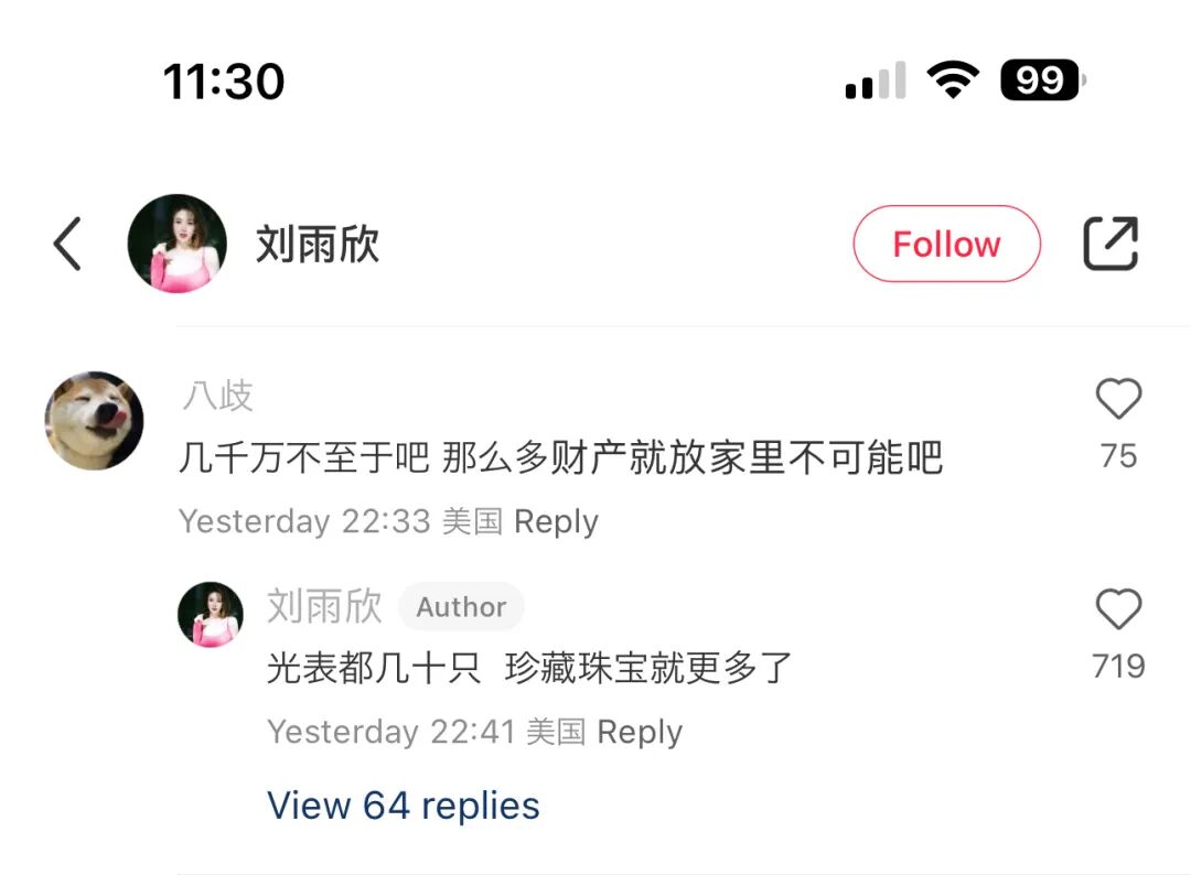 刘雨欣还在留言区与网友互动,透露住在比佛利富人区。