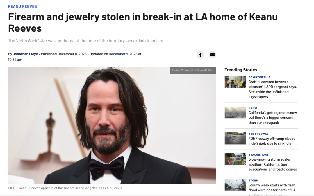 曾经饰演《黑客帝国》,《疾速追杀》(John Wick)的加拿大演员基努·查尔斯·里维斯(Keanu Charles Reeves)也在2个月前被入室抢劫过。