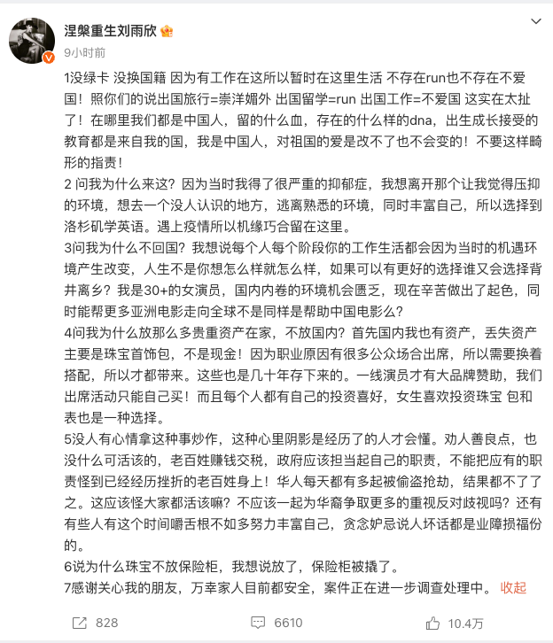 被质疑是否夸大其词被盗物品不值千万,刘雨欣回应,手表就有几十只,还有珠宝等物品。
