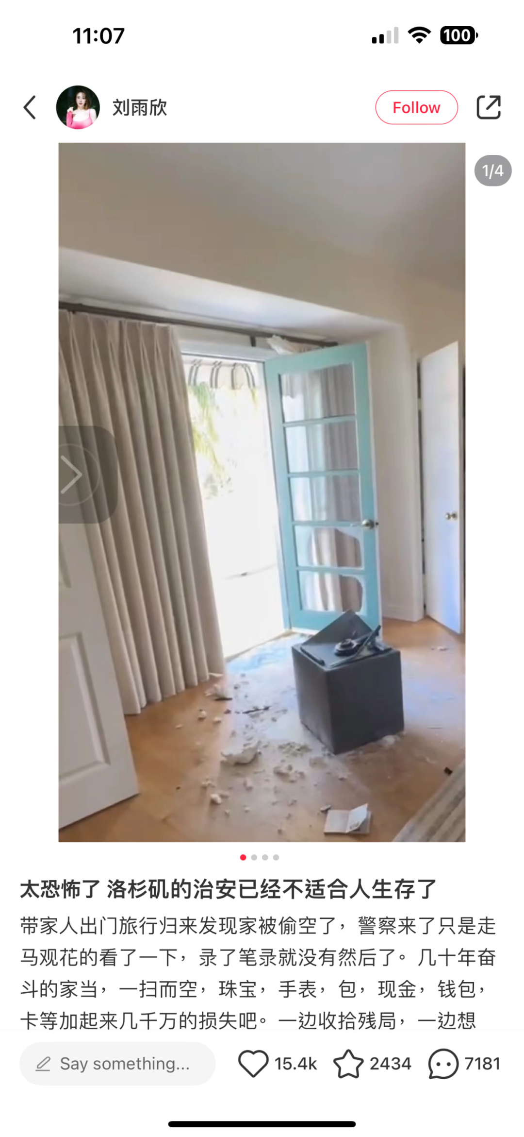 昨天(2月18日),知名女星刘雨欣在社交媒体上发贴称自己在洛杉矶的家被偷空了!