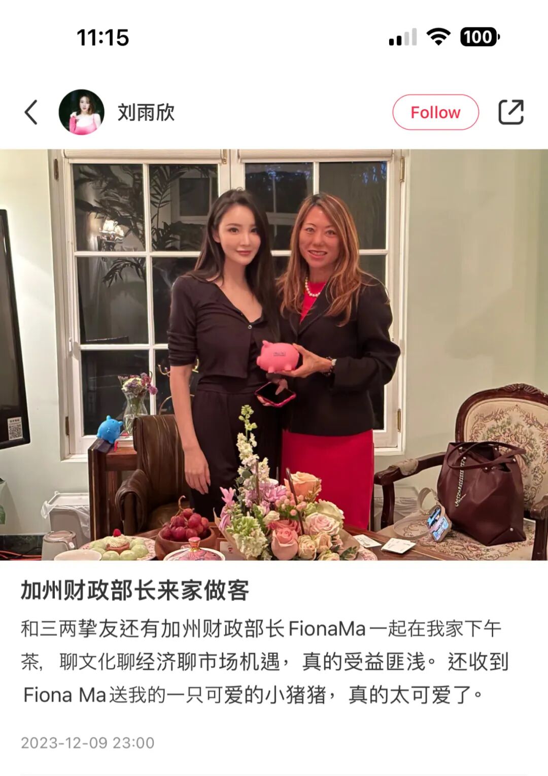 这次在洛杉矶看起来也是十分风生水起,社交媒体上都有她和加州财政部长的合影: