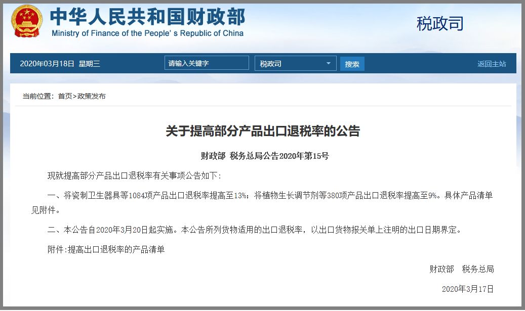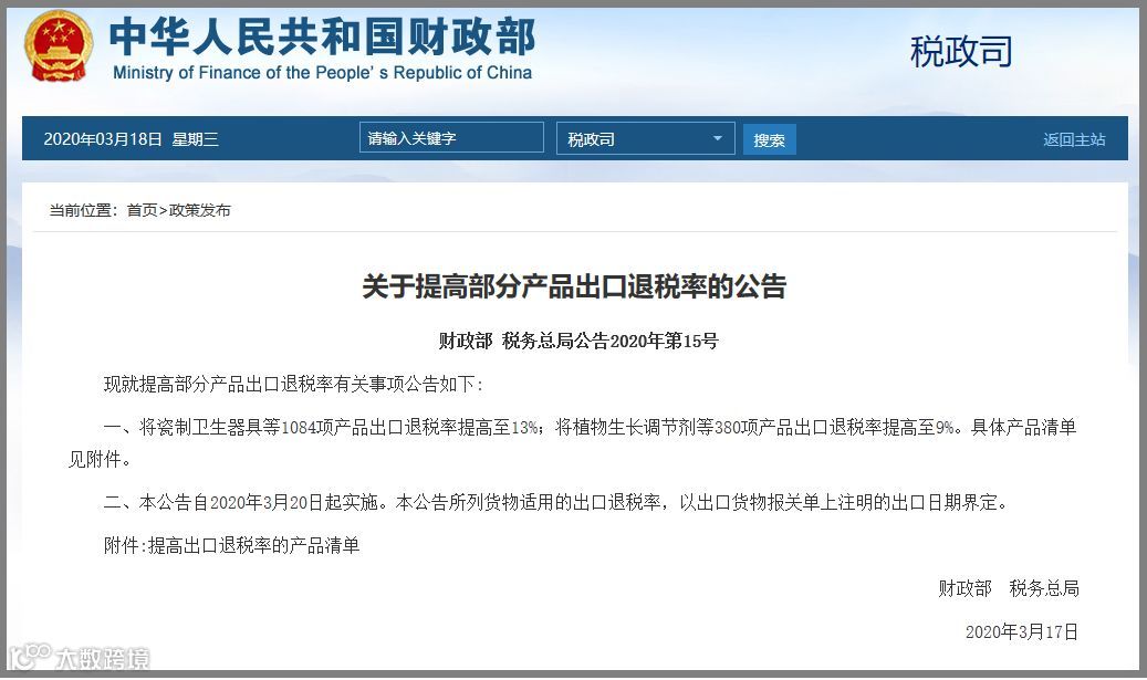 3月17日,财政部下达《关于提高部分产品出口退税率的公告》,明确今年3月20日起,将瓷制卫生器具等1084项产品出口退税率提高至13%;同时,还有380项产品出口退税率提高至9%。