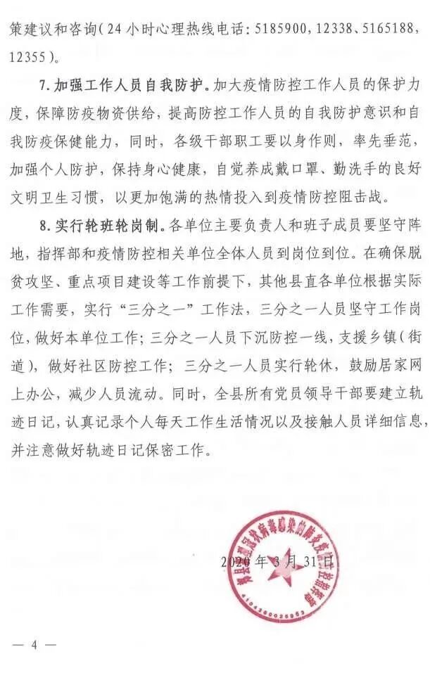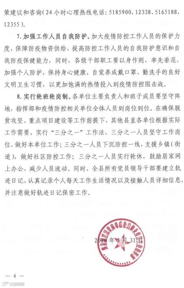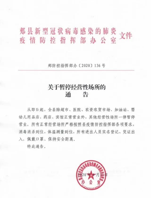 4月1日发布的《关于暂停经营性场所的通告》显示,从即日起,全县除超市、医院、农资农贸市场、加油站、婴幼儿用品店、药店、宾馆正常营业外,其他经营性场所一律暂停营业。