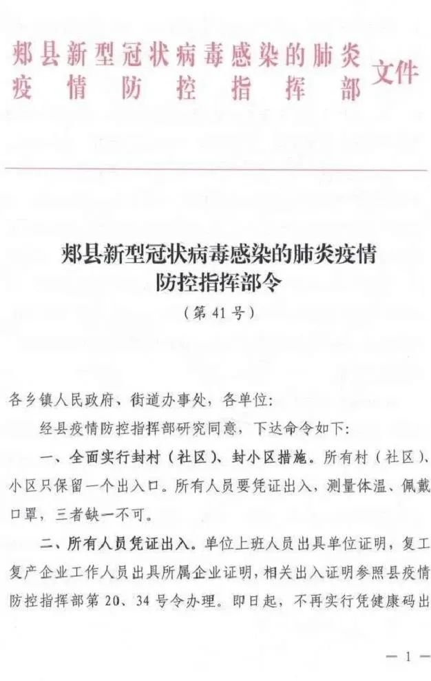 其中郏县疫情防控指挥部令第41号写道,全面实行封村(社区)、封小区措施。所有村(社区)、小区只保留一个出入口。所有人员要凭证出入,测量体温、佩戴口罩缺一不可。