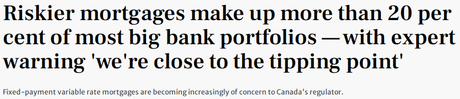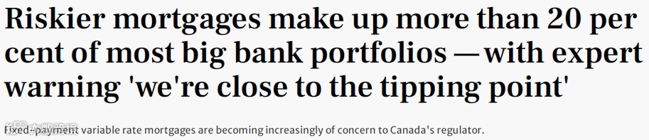 与此同时,因为风险更高的抵押贷款占大多数大银行投资组合的20%以上,所以加拿大不少银行都在接近临界点。