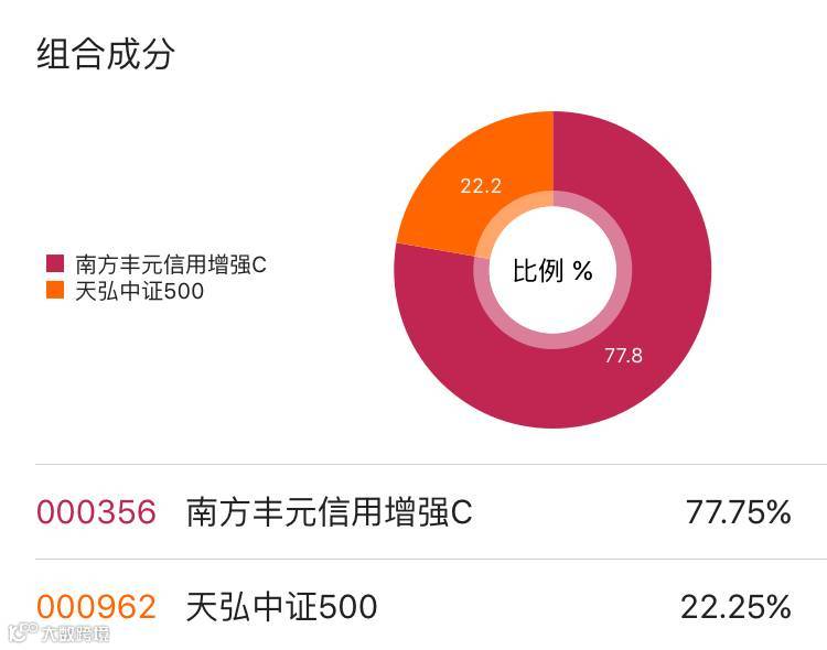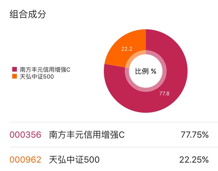 该组合20%的股票资产投资于有代表性的小盘指数-中证500指数,成长型的小盘指数具有较高收益预期,且适合长期配置。由于标的基金选择的是天弘中证500,属于被动型指数基金,相对主动型股票基金有费率低的优势。另方面组合中80%的债券资产选择了企业债券指数,因为企业债有着价格市场化、比国债更灵活、更高收益的特征。目前标的基金为南方丰元信用增强C,以企业债、金融债为主,在同类基金中费率较低,表现稳定。