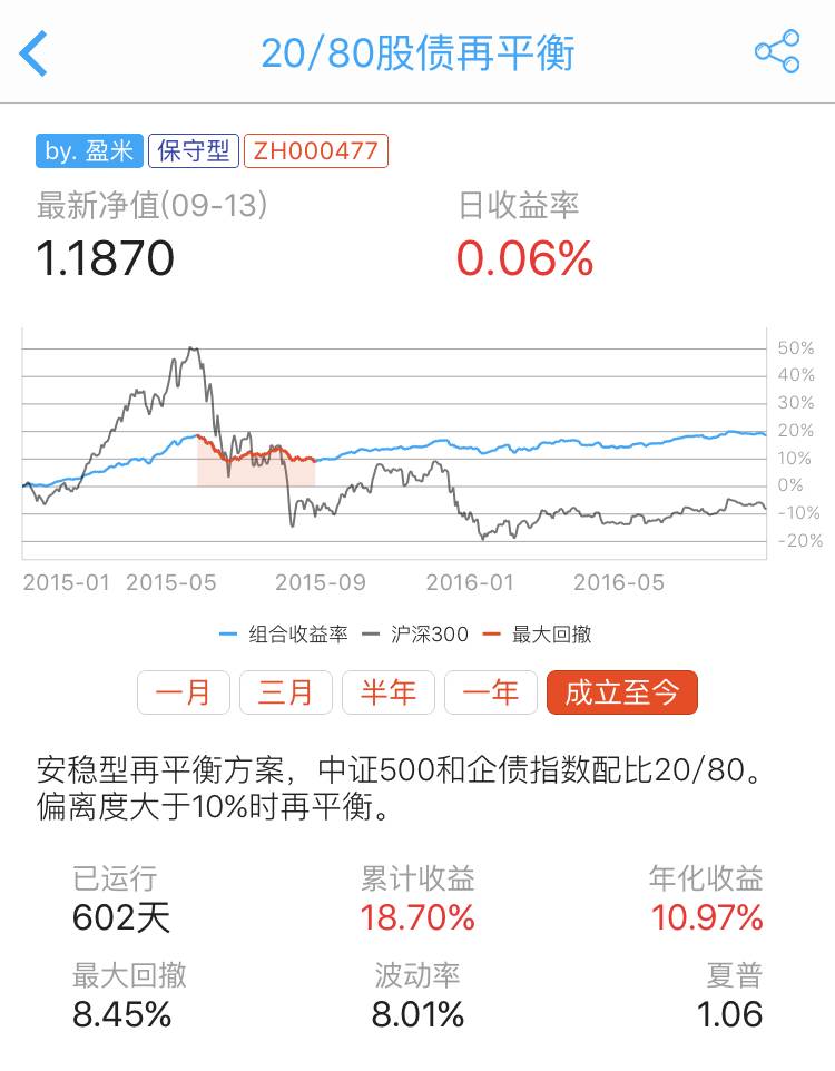 “20/80股债再平衡”可以实现很多人的投资目标,帮助解决很多人的理财难题。其标的资产分别是中证500与企业债指数,它们之间维持20/80的比例。为什么会说该组合会受到投资者的青睐?从风险收益角度来看,该组合是属于保守型的,因为80%的组合资产都分配在债券市场中,适合所有不想承担太多风险、不想花太多精力打理资产、又想让资产稳稳增值的投资者。其实大部分人都有这样一部分需求,希望将自己绝大部分资产进行合理配置,实现有效的资本积累、增值。“20/80股债再平衡”在且慢平台从2015年运行至今,累计收益约18.70%,夏普率1.06,以健康的风险收益比例实现稳健增长。
