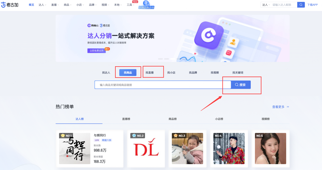 登陆考古加PC端,首页“找商品”“找直播”搜索框均可进入。