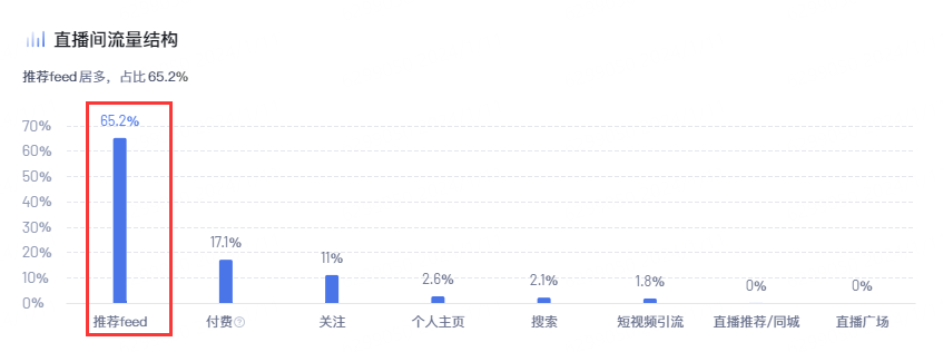 从流量结构上看,直播间65%都是feed推荐流量。