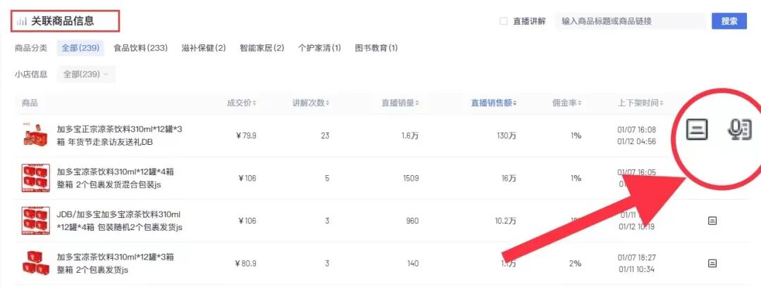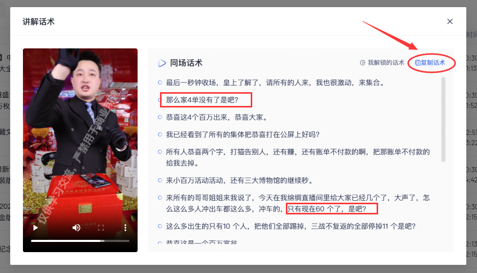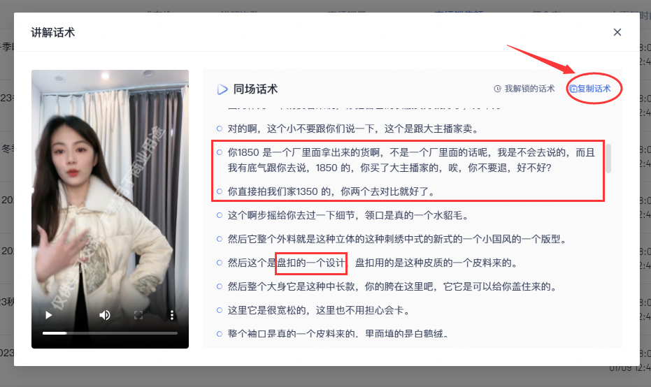 点击进入直播数据页面,找到关联商品信息,最右边出现小喇叭标识表示该商品拥有高光时刻的直播讲解画面,解锁话术即可一键提取复制。