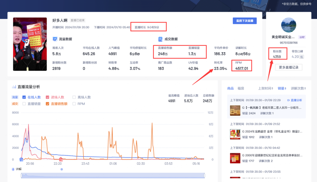 近日,在考古加数据后台发现一个叫“黄金明诚实业”的直播间数据表现优异,粉丝只有4000多,一场直播9个小时多,销售额达到248万,RPM值高达4517。