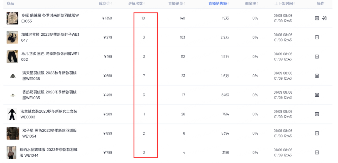 从选品和排品上来看,中式羽绒服为该直播间的主推品,讲解了10次。
