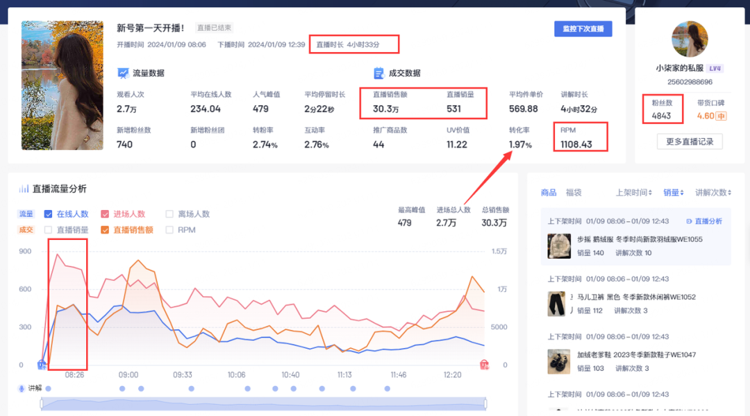 另一个账号“小柒家的私服”,粉丝4000多,做服饰品类。第一天开播4个小时多,销售额达到30万多,在直播一开始在线人气值就达到了最高。