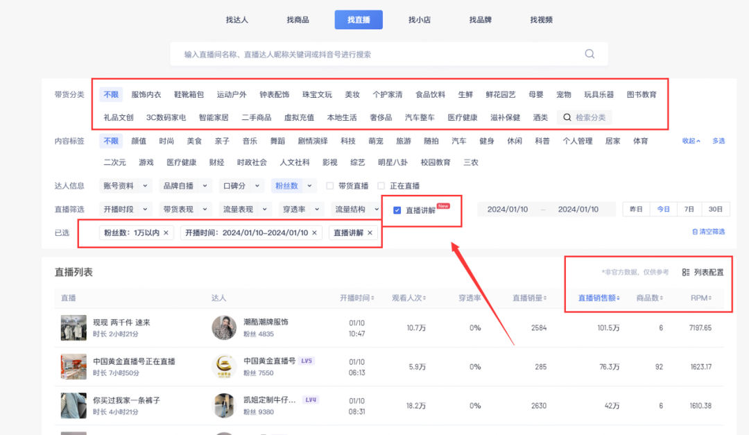 勾选“直播讲解”,时间可选择今日,昨日,7天,30天,筛选你的行业,按你所想要的数据高低排序。