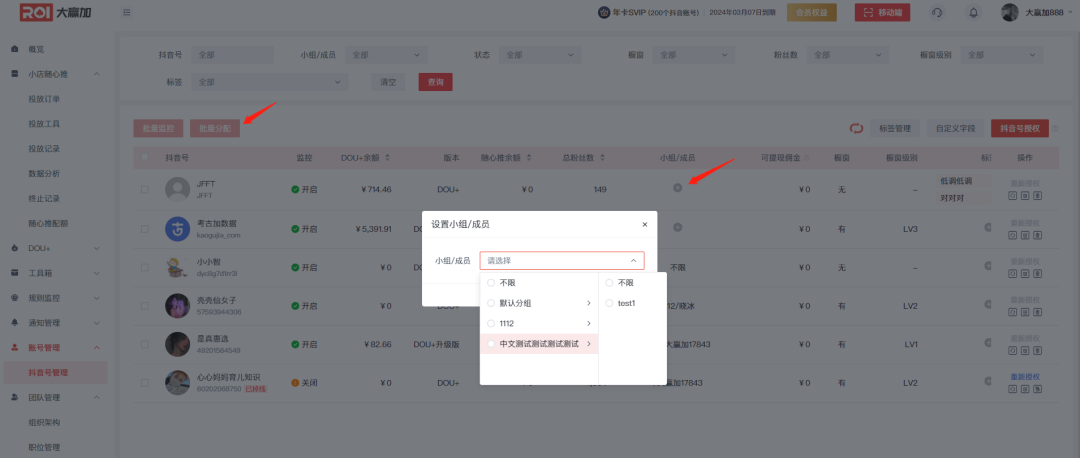 在【账号管理】的【抖音号管理】中,可批量分配抖音号给成员,省时高效。