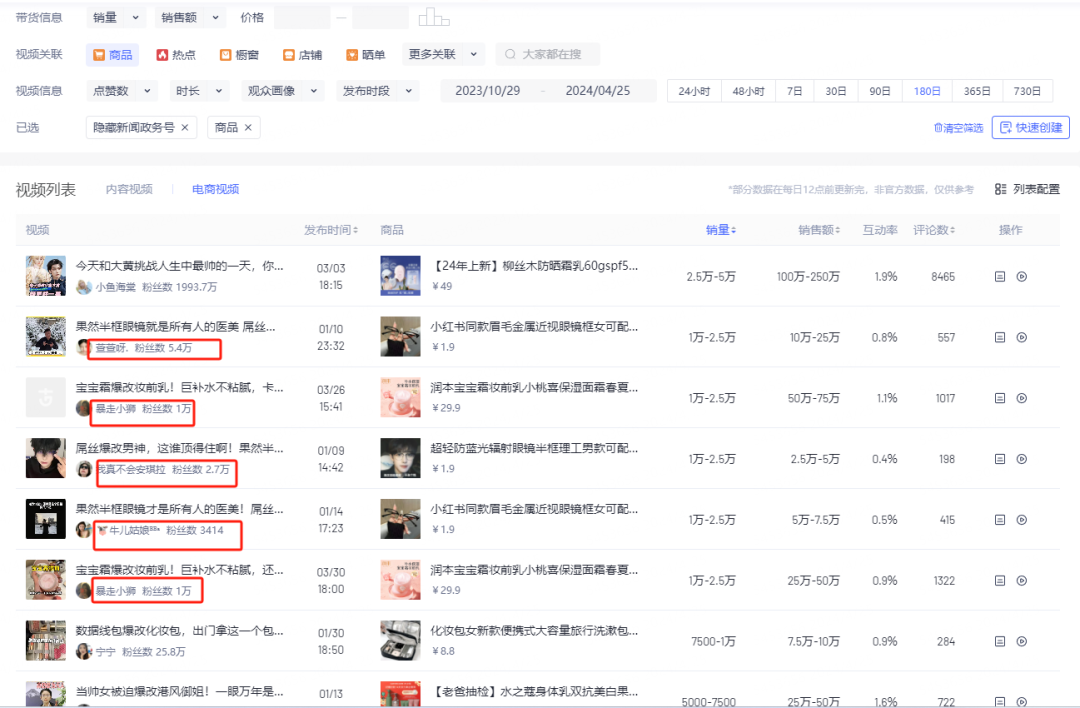 我们从考古加数据-视频库中发现,近180天内“爆改”话题下的带货视频,榜一视频为客单价49元的防晒霜,销售额最高达到了100-250万。排名前十的视频中,超6成为粉丝数低于1万的达人所发布。