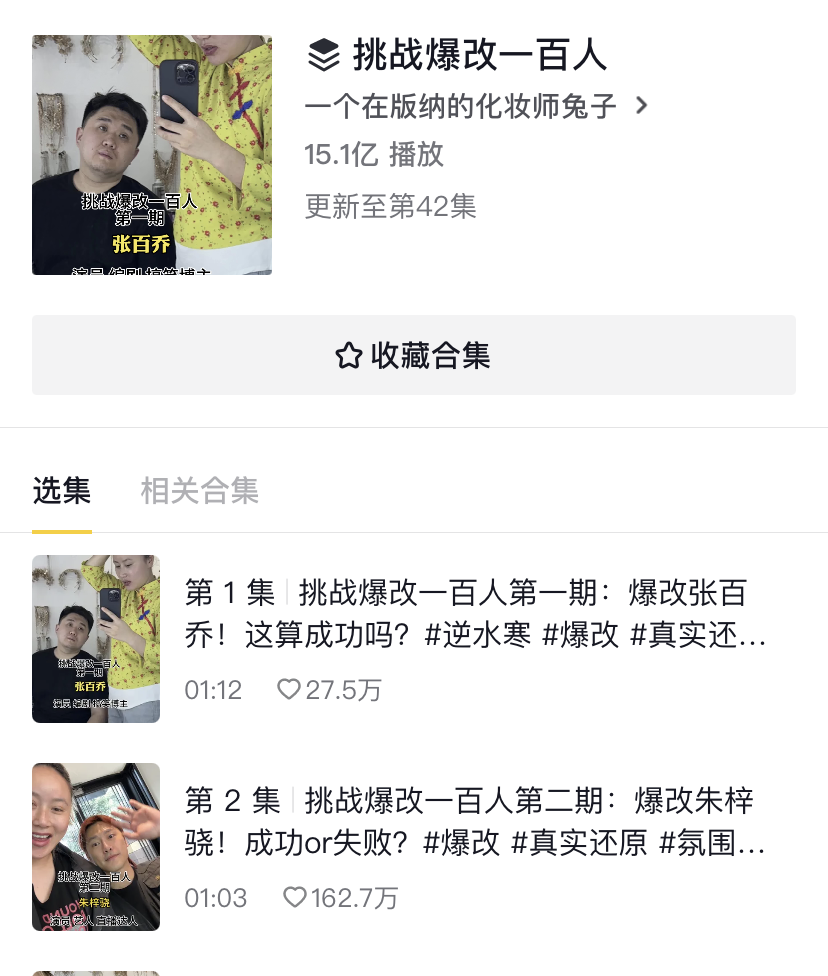 这些视频的创作逻辑,强调改造妆容的平价和即时性,突出妆造前后的高反差。妆造手法越颠覆,话题度越高。