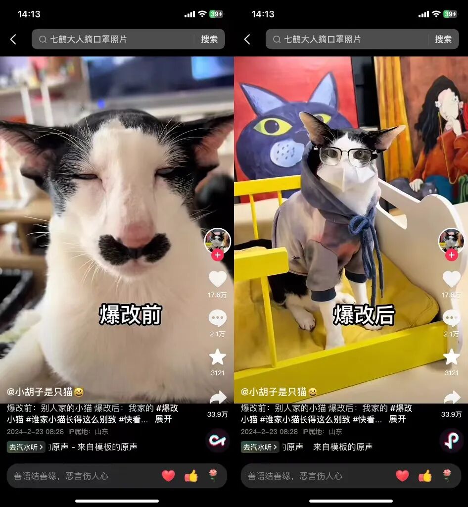 萌宠博主 @小胡是只猫,账号发布的视频内容为丑萌小猫的日常,点赞量在几百左右。而今年4月8日发布的“爆改小猫”视频,点赞量高达17.6万。