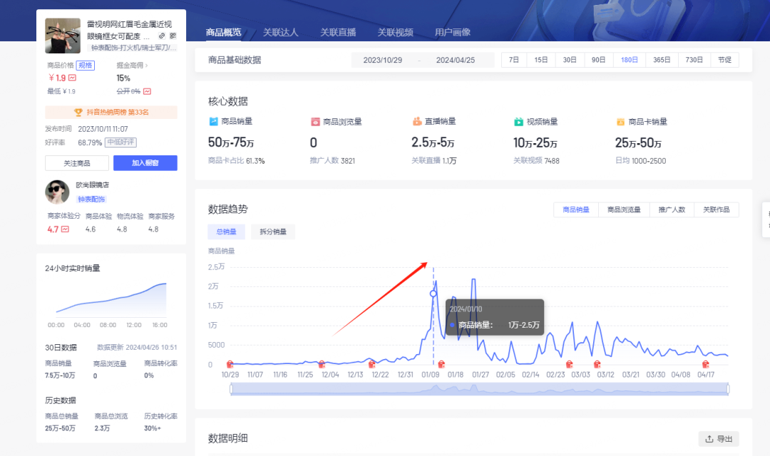 靠爆改风出圈的,还有一些客单价较低的商品。例如,一款原本0销量的【半框眼镜】,通过“爆改”系列视频,商品销售额也从默默无闻的0增长到10-25万。