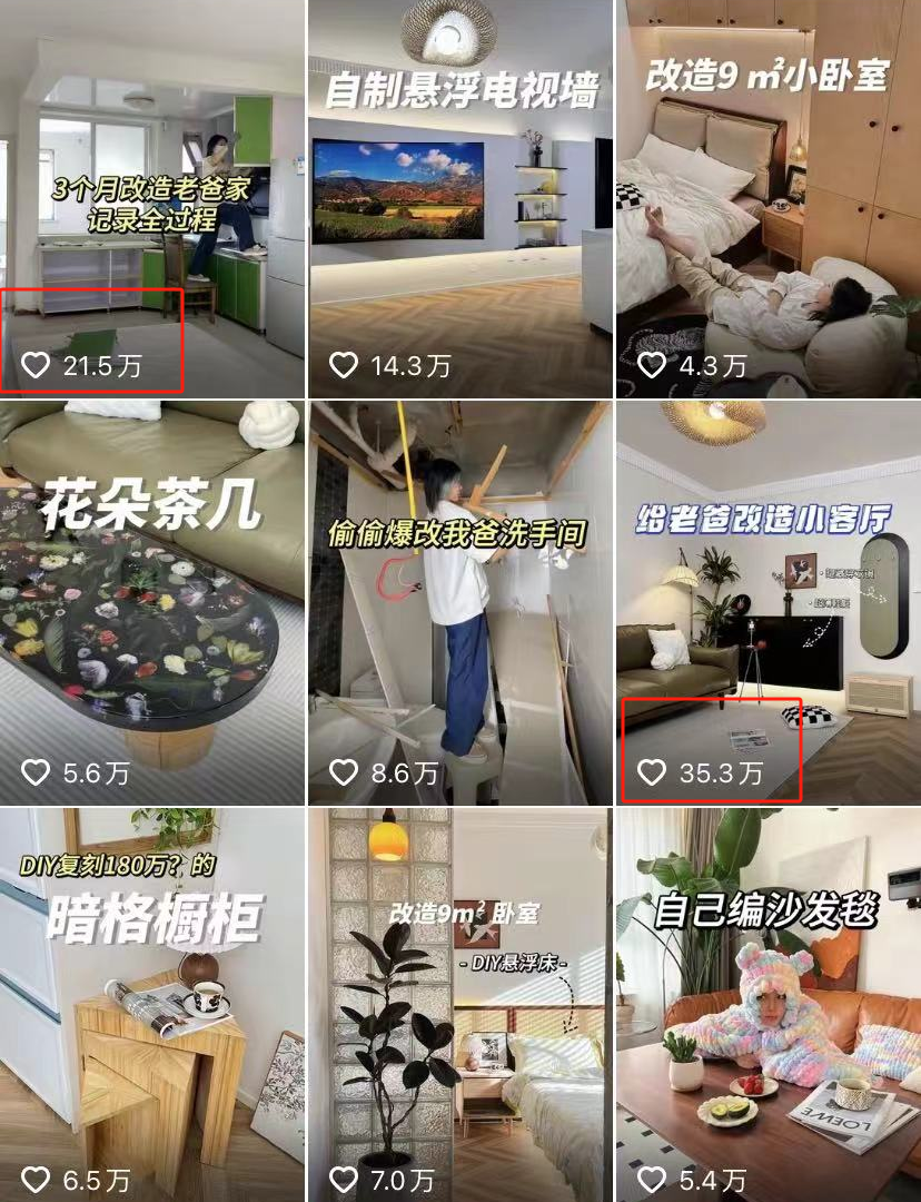 例如家居博主 @打打的小窝,往常视频点赞量在十万以下,但是“爆改老屋”系列视频却达到了20万的点赞量。