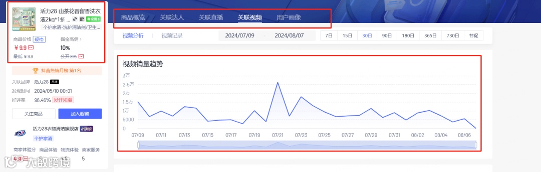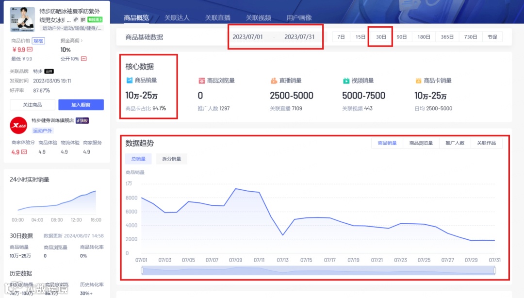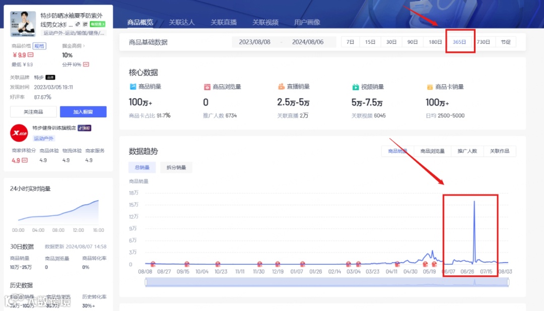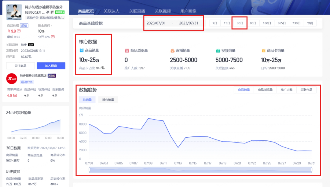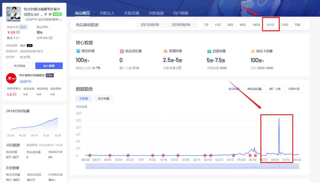 点击查看【商品详情】,可深入挖掘往年爆款商品历史数据:商品主图、价格、标题关键词、销量走势、关联视频、用户画像等等...方便商家&达人学习借鉴爆款模板和提炼商品卖点。