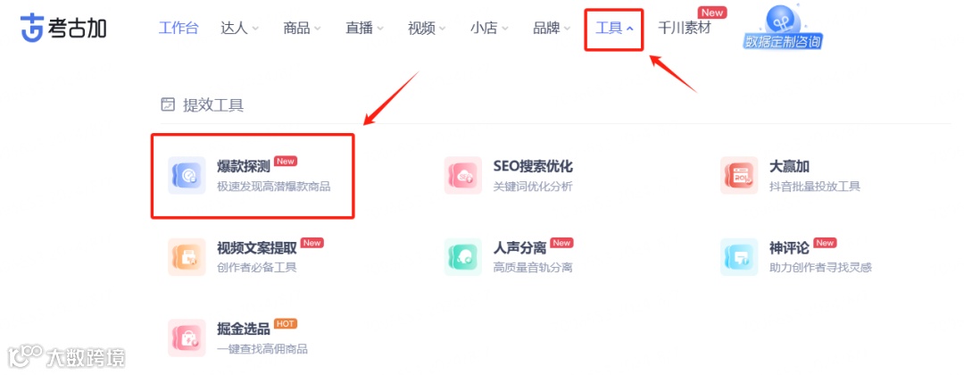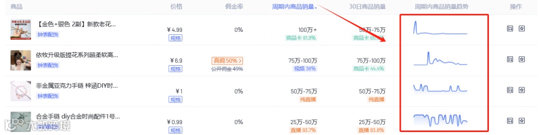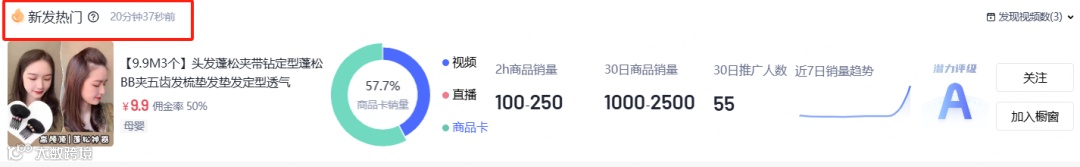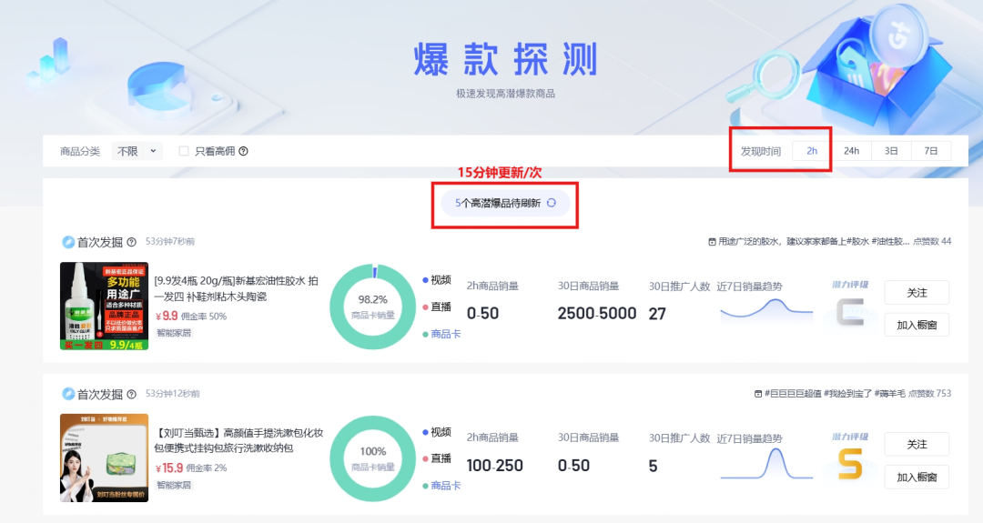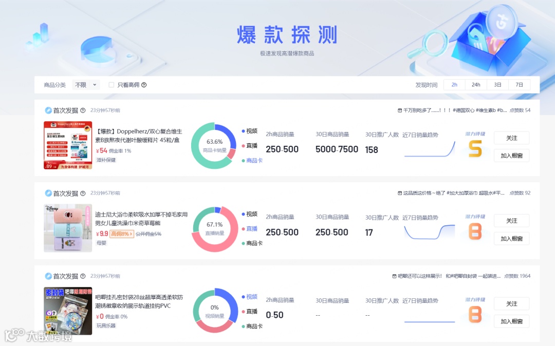 本次【爆款探测】后台算法全新升级,筛选逻辑以视频播放量为基础,同时结合商品卡及直播数据,使得商品潜力评级更精准;