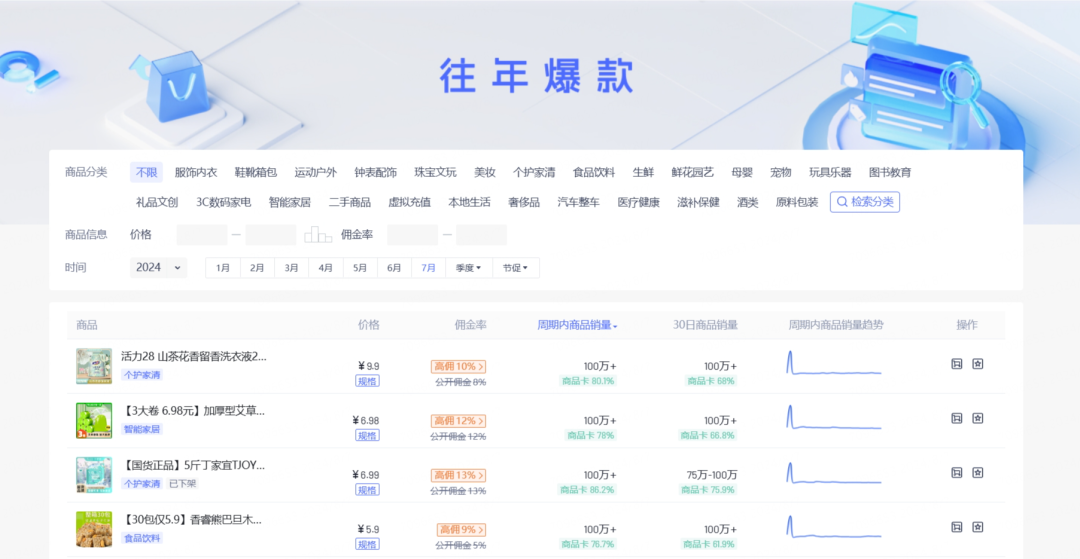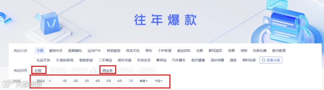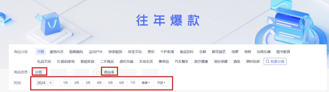 可对商品的价格及佣金率进行筛选,查看往年同期,往年同季度,往年节促等数据,帮助商家发现并分析往年爆款产品,还可结合自己供应链优势,找到符合季节性和节促热点的产品: