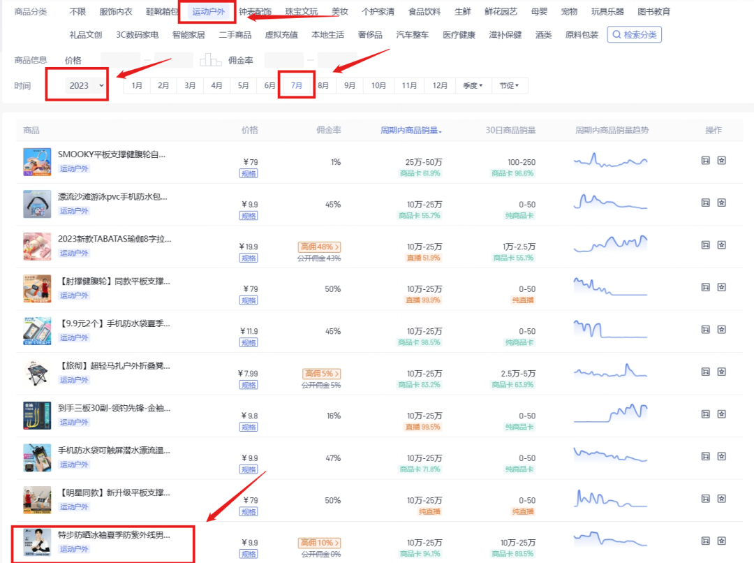 以运动户外类目为例,打开考古加-往年爆款,选择2023年7月,上百种季节性热门产品即刻呈现,商品销售趋势、销量、佣金率一目了然,为您的选品方向提供更多可能性,可以看见开头「特步」冰袖也在其中: