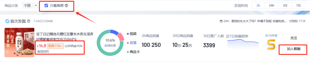 同时,【爆款探测】与掘金选品联动,可"只看高佣",一键添加高佣品至橱窗,助力短视频带货达人“躺平”选品: