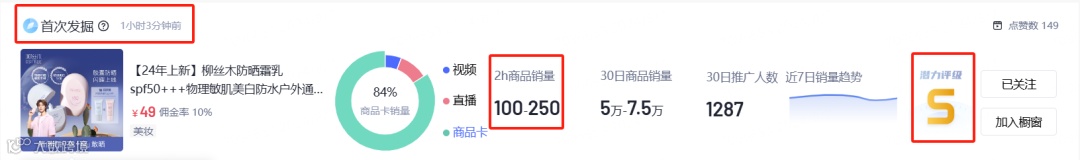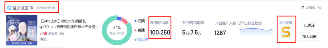 要爆的品比已爆的品更有价值,以美妆类目为例,这款"柳丝木"防晒被探测到在短短 2 小时内销量迅速攀升,并且为首次发掘的商品,潜力评级为S: