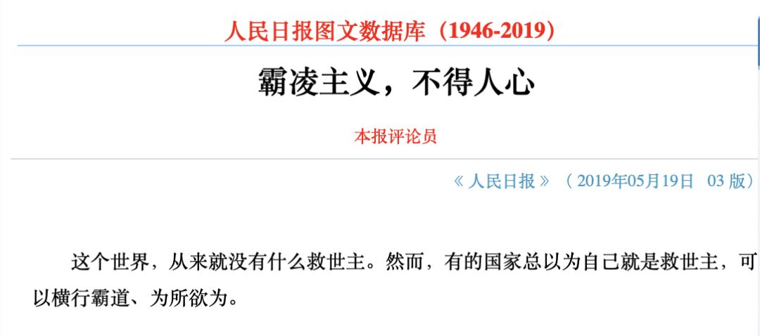《人民日报》在5月19日的评论员文章《有的国家总以为是救世主,可以横行霸道》中表示,美国已经把贸易战的战火烧向了全世界很多国家,连欧盟与日本等美国传统盟友都未能“幸免”。美国《华尔街日报》网站文章指出,“白宫决心在多条战线同时打地缘政治仗,这也表明它对国际外交、国际政治长期以来常见的一些选择持蔑视态度”。为了确保自己遥遥领先的“绝对优势”,不惜打压别国的发展权甚至生存权,“美国优先”的一意孤行,已经在世界上惹了众怒。“吹灭别人的灯,会烧掉自己的胡子。”在经济全球化深入发展、各国利益深度融合的今天,倒行逆施的霸凌主义,不仅行不通,而且十分危险。